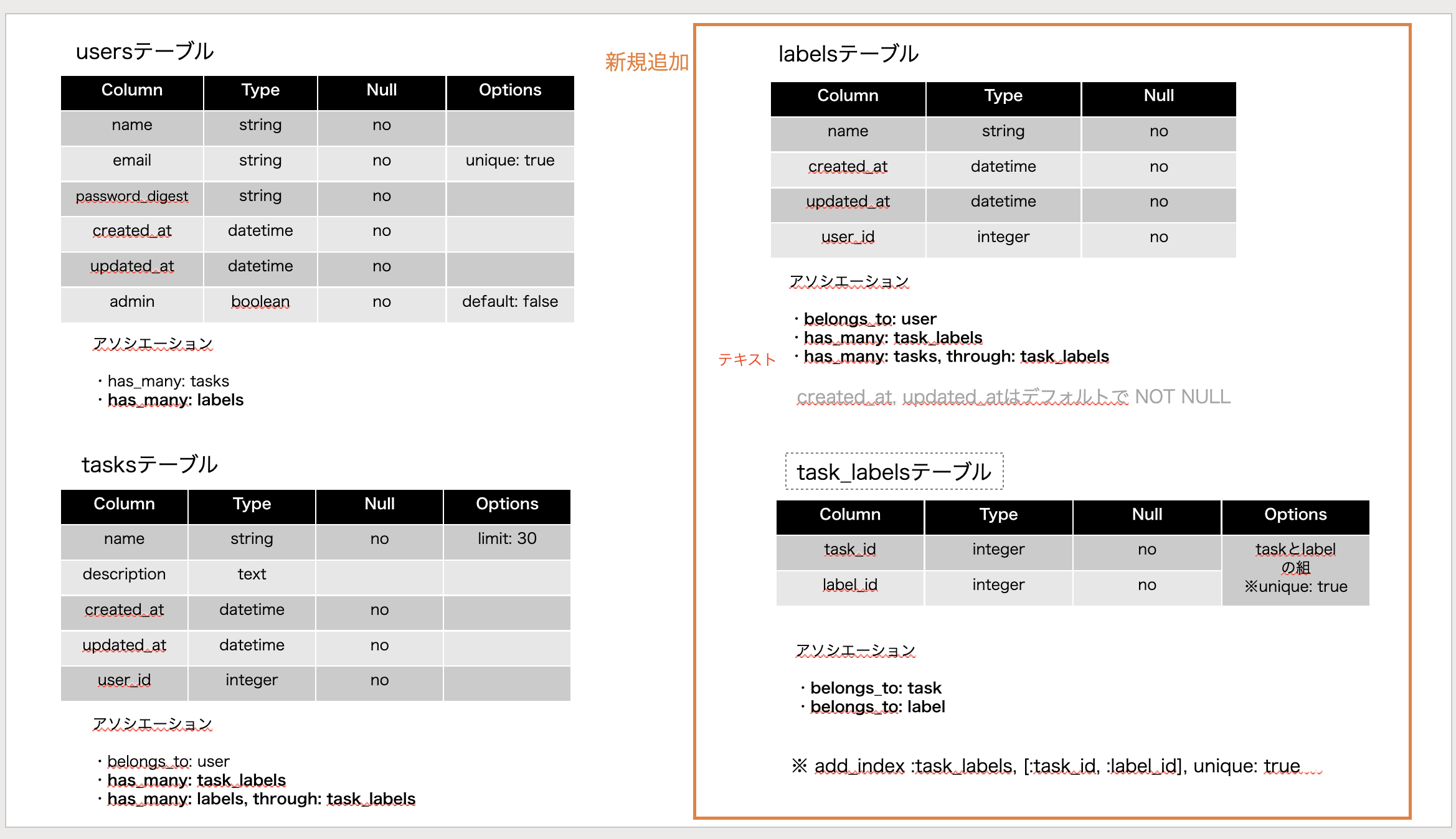 また、タスクに紐づけるラベル機能の追加では中間テーブルの設計を含めて作成しました。